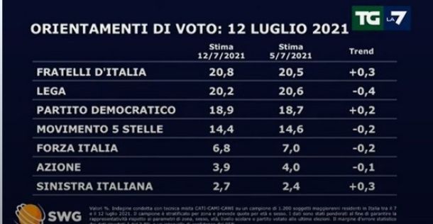 Sondaggi La7 – Swg: FdI rafforza il suo primato (20,8%), davanti a Lega (20,2%) e Pd (18,9%)