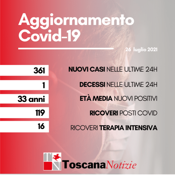 FIRENZE – Un morto per coronavirus, oggi 26 luglio 2021, in Toscana. Si tratta una donna di 72 anni, residente in provincia di Siena. E sono 361 i nuovi contagi (355 confermati con tampone molecolare e 6 da test rapido antigenico) con età media di 33 anni (29% ha meno di 20 anni, 38% tra 20 e 39 anni, 24% tra 40 e 59 anni, 6% tra 60 e 79 anni, 3% ha 80 anni o più). Con questi, il totale dei contagiati da inizio pandemia sale a 248.932. Oggi sono stati eseguiti 4.124 tamponi molecolari e 1.101 tamponi antigenici rapidi, di questi il 6,9% è risultato positivo. Sono invece 2.647 i soggetti testati oggi (con tampone antigenico e/o molecolare, escludendo i tamponi di controllo), di cui il 13,6% è risultato positivo. Gli attualmente positivi sono oggi 4.407, +6,8% rispetto a ieri. I ricoverati sono 119 (7 in più rispetto a ieri), di cui 16 in terapia intensiva (stabili).