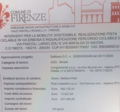 FIRENZE – Ho l’occasione di passare giornalmente da via Mafalda di Savoia, quella via che costeggia il Mugnone all’altezza del Parterre. Qui il Comune di Firenze ha avuto la brillante idea di rinnovare una pista ciclabile, che poi sfocia in un piccolo corridoio in via del Ponte Rosso. Ma soprattutto i lavori illustrati in un monumentale cartello (c’è scritto, durata dei lavori 180 giorno, di questo passo saranno 1.800) sono praticamente sospesi da almeno 10 giorni, non si vede anima viva a pagarla a peso d’oro.