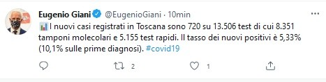 Toscana, Covid-19: Giani su twitter, 720 nuovi contagi, 13.506 tamponi, tasso a 5,33%. Forte incremento settimanale