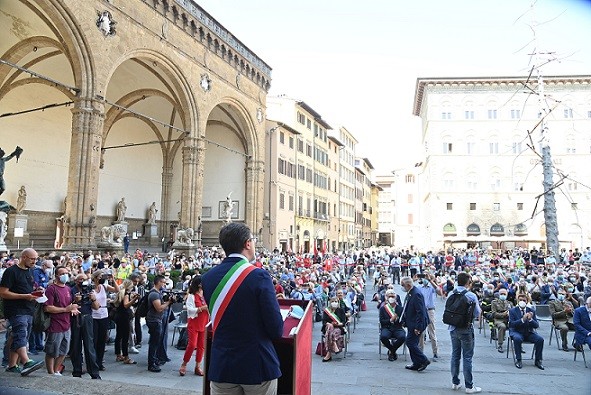 «Cari cittadini, Gonfaloni del territorio fiorentino, benvenuti in piazza della Signoria e buona Liberazione di Firenze a tutti. Saluto le autorità civili, militari, religiose, cari amici delle associazioni partigiane e combattentistiche. È per me ogni anno una nuova emozione e un grande onore celebrare insieme a tutti voi questa giornata di festa. Rivolgo un saluto particolare ai sindaci di Cavriglia Leonardo Degl’Innocenti, Marzabotto Valentina Cuppi, Monsummano Terme Simona De Caro e Stazzema Maurizio Verona. Li ringrazio per aver accettato il mio invito ed essere presenti per portare una testimonianza delle immani tragedie che la ritirata del regime nazifascista ha provocato nei nostri territori. È nostro dovere, infatti, ricordare con sempre più forza ciò che è stato quel regime, cosa ha rappresentato per le tante vittime innocenti e cosa ha lasciato il suo passaggio.