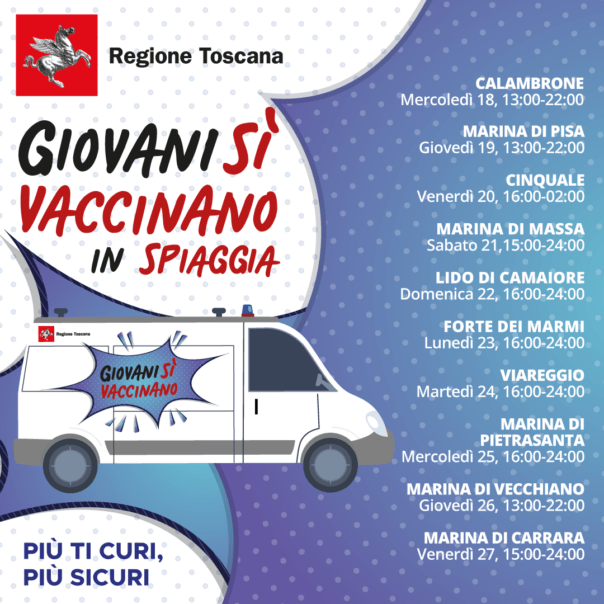 FIRENZE – Continua la campagna di vaccinazione nelle spiagge della Toscana. Il calendario (vedi grafico nella foto) fisdsa le date da oggi, 18 agosto 2021, al Calambrone, fino al 27 agosto a Marina di Carrara. Una vaccinazione che sta ottenendo grande successo soprattutto nella fascia fra 12 e 18 anni.