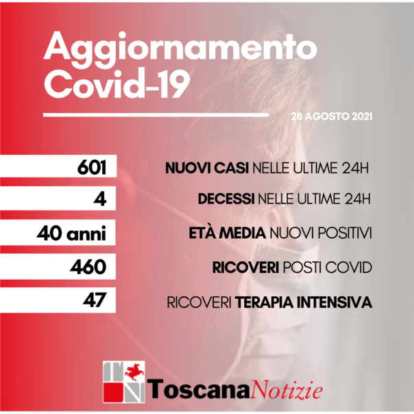 FIRENZE – In Toscana oggi 28 agosto registrati 4 nuovi decessi: 3 uomini e una donna con un’età media di 77 anni (1 a Firenze, 1 a Pistoia, 2 a Siena).sono 270.006 i casi di positività al Coronavirus, 601 in più rispetto a ieri (590 confermati con tampone molecolare e 11 da test rapido antigenico). I nuovi casi sono lo 0,2% in più rispetto al totale del giorno precedente. I guariti crescono dello 0,3% e raggiungono quota 251.517 (93,2% dei casi totali). Oggi sono stati eseguiti 8.653 tamponi molecolari e 5.858 tamponi antigenici rapidi, di questi il 4,1% è risultato positivo. Sono invece 6.187 i soggetti testati oggi (con tampone antigenico e/o molecolare, escludendo i tamponi di controllo), di cui il 9,7% è risultato positivo. Gli attualmente positivi sono oggi 11.486, -0,9% rispetto a ieri. I ricoverati sono 460 (13 in più rispetto a ieri), di cui 47 in terapia intensiva (1 in più).