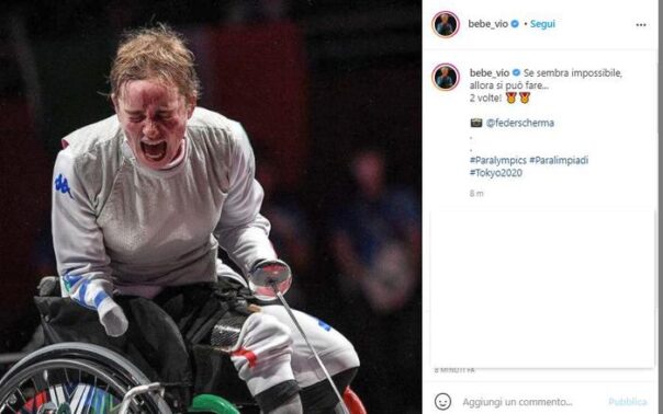 TOKYO – Bebe Vio ha conquistato il suo secondo oro paralimpico nel fioretto femminile, categoria B. A Tokyo la 24enne di Momigliano Veneto ha sconfitto per 15-9 la cinese Jingjing Zhou, che già aveva battuto in finale a Rio 2016 per 15-7. La fiorettista italiana ha festeggiato la conquista con la consueta esultanza (vedi foto sopra), che fece colpo prima su Napolitano e poi su Mattarella. Quella conquistata dalla 24enne veneta è la quinta medaglia d’oro di questa edizione dei Giochi per l’Italia, Salgono a 18 le medaglie dell’Italia ai Giochi paralimpici giapponesi.