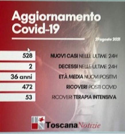 FIRENZE – Oggi, 29 agosto, in Toscana si registrano 2 nuovi decessi: 2 uomini, con un’età media di 90,5 anni, in provincia di Grosseto. Sono 528 i nuovi casi di positività al Coronavirus, (511 confermati con tampone molecolare e 17 da test rapido antigenico) che portano il totale a 270.534. I nuovi casi sono lo 0,2% in più rispetto al totale del giorno precedente. I guariti crescono dello 0,2% e raggiungono quota 251.949 (93,1% dei casi totali). Oggi sono stati eseguiti 8.749 tamponi molecolari e 5.547 tamponi antigenici rapidi, di questi il 3,7% è risultato positivo. Sono invece 7.016 i soggetti testati oggi (con tampone antigenico e/o molecolare, escludendo i tamponi di controllo), di cui il 7,5% è risultato positivo. Gli attualmente positivi sono oggi 11.580, +0,8% rispetto a ieri. I ricoverati sono 472 (12 in più rispetto a ieri), di cui 53 in terapia intensiva (6 in più).