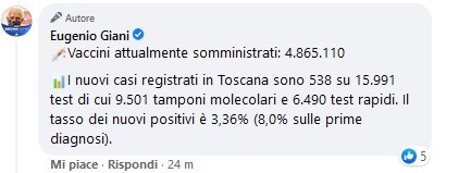 FIRENZE – Come al solito il Giani ci dà i numeri del coronavirus in Toscana, oggi 1 Settembre, sui social, diventati ormai il bollettino ufficiale della regione toscana. Sono 538 i nuovi casi di Coronavirus su 15.991 test.  Il tasso di nuovi positivi è pari al 3,36% sul totale dei test e all’8% sulle prime diagnosi.