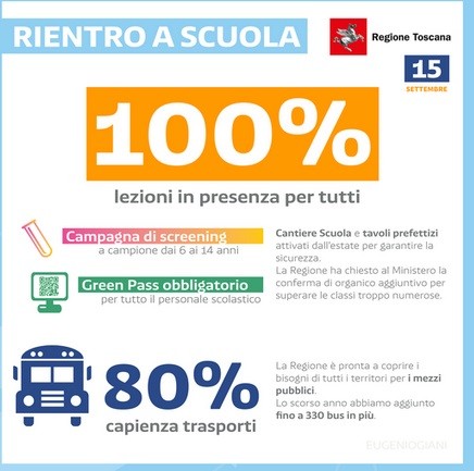 Ma non solo covid. Il Giani ci dà anticipazioni su tutto, anche sulla riapertura delle scuole, pur se il nodo dei trasporti è ancora in piedi. Ma su Facebook questa vignetta del Presidente ci rassicura: 100% lezioni in presenza, 80% capienza dei trasporti, green pass obbligatorio, campagna di screening in atto. Chi meglio della Toscana?