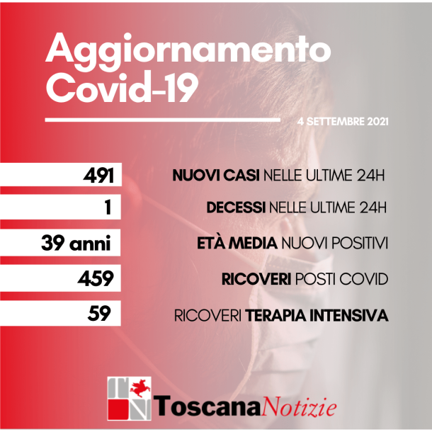FIRENZE – Situazione del coronavirus, oggi, 4 settembre, in Toscana si registra 1 nuovo decesso: un uomo di 56 anni. Relativamente alla provincia di residenza, la persona deceduta è a Arezzo. Sono 491 in più rispetto a ieri i nuovi casi positivi in Toscana (485 confermati con tampone molecolare e 6 da test rapido antigenico), che portano a 273.434 i casi registrati dall’inizio della pandemia. I nuovi casi sono lo 0,2% in più rispetto al totale del giorno precedente. L’età media dei 491 nuovi positivi odierni è di 39 anni circa (21% ha meno di 20 anni, 32% tra 20 e 39 anni, 30% tra 40 e 59 anni, 12% tra 60 e 79 anni, 5% ha 80 anni o più).