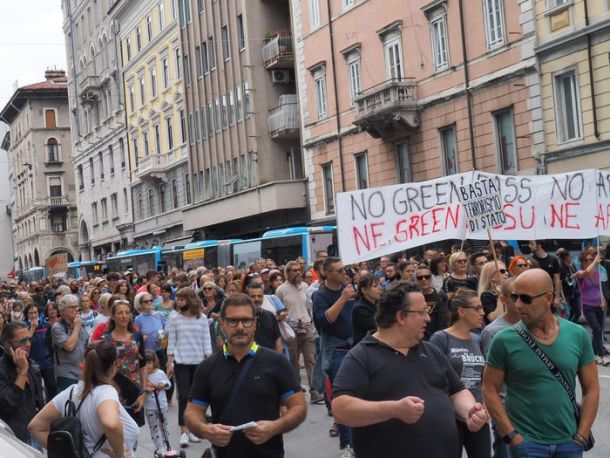 Corteo a Trieste con migliaia di persone. La manifestazione si è conclusa poco dopo le 13 con il corteo che, dopo aver stazionato davanti alla sede della Regione Fvg, si è sciolto. Al megafono, proprio in piazza, è intervenuto anche il candidato sindaco Ugo Rossi del Movimento 3V (no Vax). «Abbiamo fatto parte del coordinamento del corteo fin dal suo primo appuntamento, a inizio settembre – ha detto -. in questa occasione non portiamo bandiere politiche», annunciando che nel pomeriggio il movimento si riunirà nuovamente in piazza ma sarà per parlare di economia circolare.