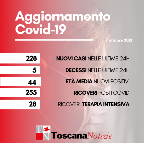 Coronavirus in Toscana: 5 morti (età media 75 anni), oggi 7 ottobre. E 228 contagi