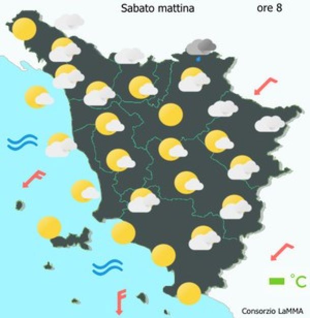 Sabato 9 Ottobre – Stato del cielo e fenomeni: parzialmente nuvoloso con ampie schiarite sulla costa e in generale sulle zone più occidentali; addensamenti più consistenti sui crinali e sull’Appennino orientale dove saranno possibili e deboli piogge. Venti: settentrionali tra deboli e moderati. Fino a forti sui rilievi più alti.