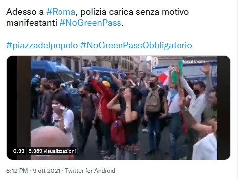 La situazione è illustrata con video anche da qualche manifestante su twitter, che afferma: «la Polizia carica senza motivo» link al video