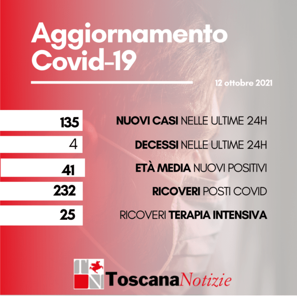 FIRENZE – Sono quattro i morti di coronavirus, in Toscana, oggi 12 ottobre 2021. Risiedevano tutti a Firenze e avevano un’età media di 90 anni. Soo invece in calo, 135, i nuovi contagi (128 sono confermati con tampone molecolare e 7 da test rapido antigenico) con età media di 41 anni (29% ha meno di 20 anni, 20% tra 20 e 39 anni, 27% tra 40 e 59 anni, 16% tra 60 e 79 anni, 8% ha 80 anni o più). E salgomo a 284.755 i casi totali di positività al Coronavirus da inizio panedmia. I guariti crescono dello 0,1% e raggiungono quota 271.907 (95,5% dei casi totali). Oggi sono stati eseguiti 7.445 tamponi molecolari e 11.752 tamponi antigenici rapidi, di questi lo 0,7% è risultato positivo. Sono invece 5.827 i soggetti testati oggi (con tampone antigenico e/o molecolare, escludendo i tamponi di controllo), di cui il 2,3% è risultato positivo. Gli attualmente positivi sono oggi 5.632, -1,9% rispetto a ieri. I ricoverati sono 232 (13 in meno rispetto a ieri), di cui 25 in terapia intensiva (stabili).