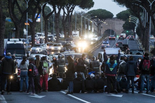 La catastrofe arriva, è tempo di agire e Da Roma a Glasgow le vostre iniziative sono il problema: questi alcuni degli slogan scanditi dagli attivisti di Climate Camp, nel frattempo partiti in corteo sulla Colombo e diretti al Mite, sempre scortati dalle forze dell’ordine. Ci dirigiamo al ministero che è l’esempio di quello che non vogliamo. Una transizione ecologicamente finta, ha detto uno dei manifestanti. Se non cambierà bloccheremo le città, urlano i manifestanti.