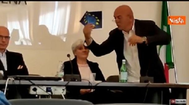 Siena: Rizzo(segretario Partito Comunista) strappa la bandiera europea, Letta non gradisce (video)