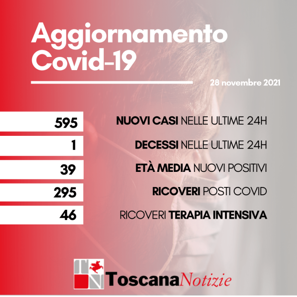 FIRENZE – E’ morta una donna di 78 anni, di coronavirus, oggi 28 novembre 2021. Risiedeva a Siena. Ma sono ben 595, quindi un nuovo picco, i contagiati di oggi (561 confermati con tampone molecolare e 34 da test rapido antigenico) con età media di 39 anni (27% ha meno di 20 anni, 21% tra 20 e 39 anni, 30% tra 40 e 59 anni, 18% tra 60 e 79 anni, 4% ha 80 anni o più). Il totale dei positivi da inizio pandemia sale a 300.647. I guariti crescono dello 0,1% e raggiungono quota 284.145 (94,5% dei casi totali). Oggi sono stati eseguiti 9.050 tamponi molecolari e 21.034 tamponi antigenici rapidi, di questi il 2% è risultato positivo. Sono invece 8.343 i soggetti testati oggi (con tampone antigenico e/o molecolare, escludendo i tamponi di controllo), di cui il 7,1% è risultato positivo. Gli attualmente positivi sono oggi 9.103, +4,8% rispetto a ieri. I ricoverati sono 295 (1 in più rispetto a ieri), di cui 46 in terapia intensiva (2 in meno).
