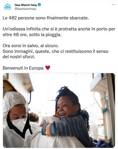 Twitta la Ong tedesca: «Le 482 persone sono finalmente sbarcate dalla nave SeaWatch 4 ad Augusta. Un’odissea infinita che si è protratta anche in porto per oltre 48 ore, sotto la pioggia. Ora sono in salvo, al sicuro. Sono immagini, queste, che ci restituiscono il senso dei nostri sforzi». Lo riferisce in un tweet l’organizzazione no