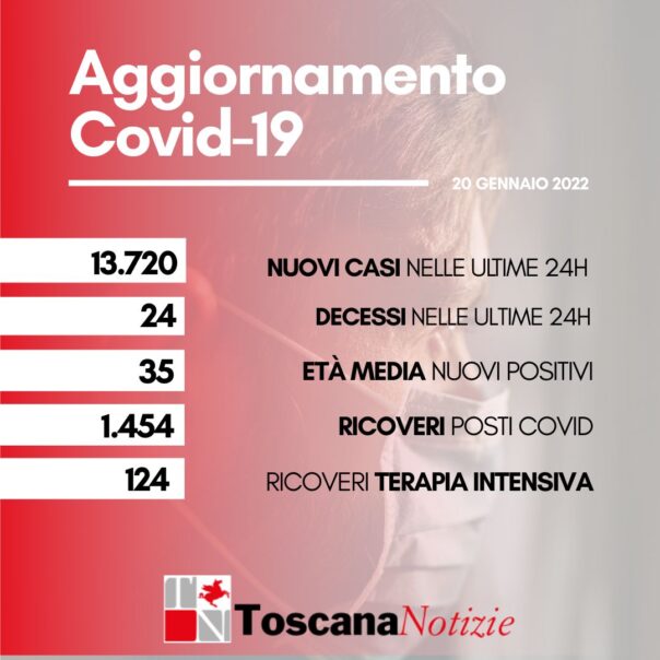 FIRENZE – Sono 24 i morti per coronavirus di oggi, 20 gennaio 2022, in Toscana. Si tratta di 15 uomini e 9 donne con età media di 80 anni. Relativamente alla provincia di residenza, le persone decedute sono: 8 a Firenze, 1 a Prato, 2 a Lucca, 6 a Pisa, 3 a Livorno, 2 a Arezzo, 1 a Siena, 1 fuori Toscana. Sono 13.720 i nuovi contagiati (5.894 confermati con tampone molecolare e 7.826 da test rapido antigenico) con età media di 35 anni (30% ha meno di 20 anni, 24% tra 20 e 39 anni, 31% tra 40 e 59 anni, 11% tra 60 e 79 anni, 4% ha 80 anni o più). In totale da inizio pandemia i positivi risultano essere 628.124. I nuovi casi sono il 2,2% in più rispetto al totale del giorno precedente. I guariti crescono del 2,3% e raggiungono quota 440.184 (70,1% dei casi totali). Oggi sono stati eseguiti 22.921 tamponi molecolari e 55.520 tamponi antigenici rapidi, di questi il 17,5% è risultato positivo. Sono invece 18.278 i soggetti testati oggi (con tampone antigenico e/o molecolare, escludendo i tamponi di controllo), di cui il 75,1% è risultato positivo. Gli attualmente positivi sono oggi 179.991, +2,1% rispetto a ieri. I ricoverati sono 1.454 (13 in più rispetto a ieri), di cui 124 in terapia intensiva (3 in meno).