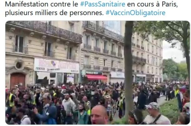 PARIGI – Due giorni prima che il pass vaccinale francese (il corrispettivo del super green pass) entri in vigore, decine di migliaia di no-green-pass hanno marciato per le strade di diverse città della Francia, chiedendo libertà e inveendo contro l’apartheid a loro dire imposta dal governo tra vaccinati e non vaccinati.