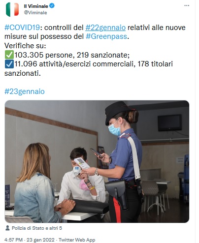 ROMA – Il Viminale ha modernizzato la sua comunicazione e adesso pubblica le notizie sul suo account twitter. Ieri, 23 gennaio, ad esempio ha pubblicato il resoconto dei controlli effettuati il 22 gennaio sul rispetto delle regole governative sul coronavirus,  103.305 persone controllate, 219 sanzionate, 11.096 esercizi commerciali controllati, 178 titolari sanzionati; ecco qui sotto il tweet: