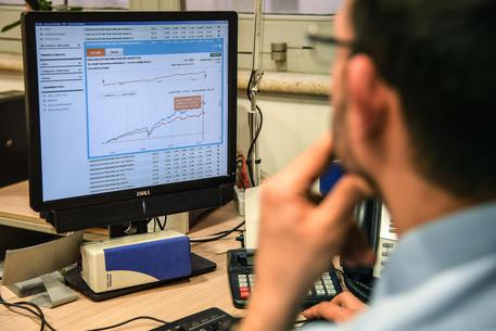 Un broker analizza il grafico dei tassi di gestione dei fondi patrimoniali nella filiale di una banca, Roma,