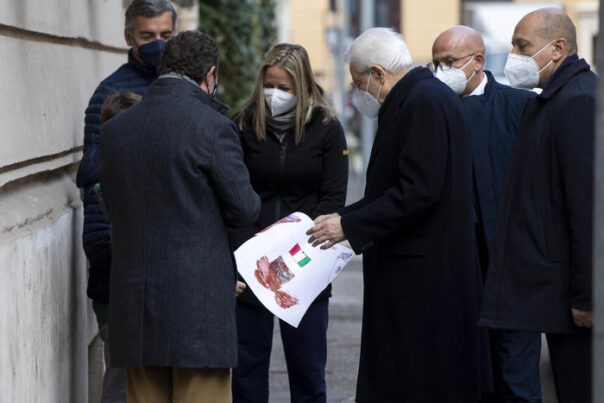 Mattarella: altro trasloco parziale, applausi, un bambino regala disegno con tricolore