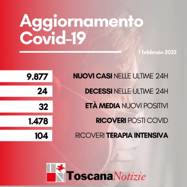 FIRENZE – Sono 24 i morti per coronavirus, in Toscana, oggi 1 febbraio 2022. Si tratta di 12 uomini e 12 donne con età media di 80 anni. Relativamente alla provincia di residenza, le 24 persone decedute sono: 8 a Firenze, 1 a Prato, 4 a Pistoia, 1 a Massa Carrara, 3 a Lucca, 1 a Pisa, 1 a Livorno, 2 a Arezzo, 1 a Grosseto, 2 fuori Toscana. Sono 9.877 i nuovi contagiati (2.861 confermati con tampone molecolare e 7.016 da test rapido antigenico) con età media di 32 anni (31% ha meno di 20 anni, 22% tra 20 e 39 anni, 33% tra 40 e 59 anni, 11% tra 60 e 79 anni, 3% ha 80 anni o più). E salgono a 749.183 i casi di positività da inizio pandemia. I nuovi casi sono l’1,3% in più rispetto al totale del giorno precedente. I guariti crescono del 2,5% e raggiungono quota 592.686 (79,1% dei casi totali). Oggi sono stati eseguiti 15.552 tamponi molecolari e 69.629 tamponi antigenici rapidi, di questi l’11,6% è risultato positivo. Sono invece 13.527 i soggetti testati oggi (con tampone antigenico e/o molecolare, escludendo i tamponi di controllo), di cui il 73% è risultato positivo. Gli attualmente positivi sono oggi 148.210, -3% rispetto a ieri. I ricoverati sono 1.478 (1 in più rispetto a ieri), di cui 104 in terapia intensiva (8 in meno).