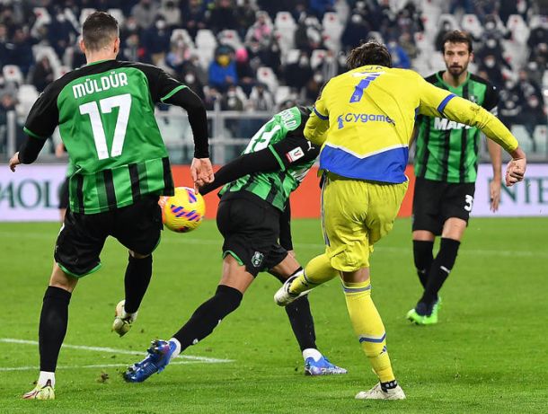 La Juve parte col piede sull’acceleratore, il vantaggio arriva dopo appena 155 secondi: affondo di Alex Sandro sulla corsia mancina, il tiro di McKennie è respinto ma il pallone capita sul sinistro di Dybala, il quale non perdona Pegolo dal dischetto. Sembra il preludio ad una gara in discesa, invece l’1-0 scuote il Sassuolo e distrae la Juve. La squadra di Allegri cala di concentrazione e commette gravi errori in impostazione, come quando Bonucci serve Berardi e Perin deve superarsi sulla conclusione