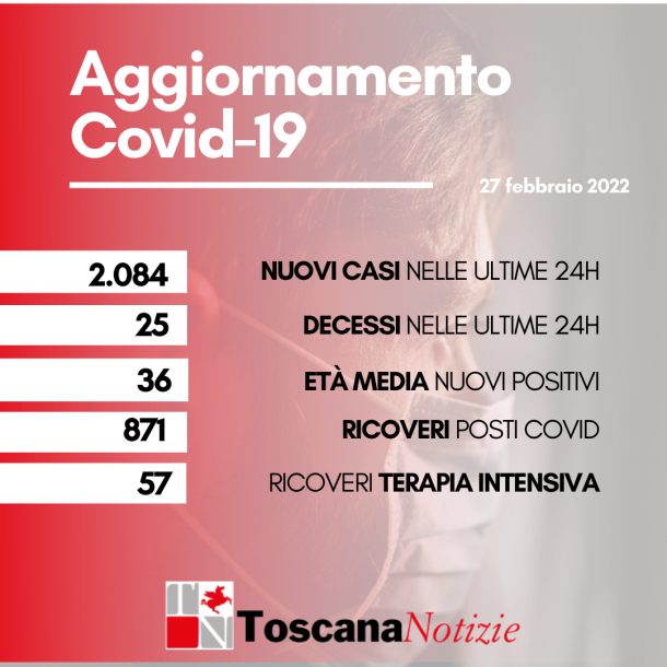 Covid Toscana: 25 morti (età media di 82,3 anni), oggi 27 febbraio, 2.084 nuovi casi, 57 terapie intensive