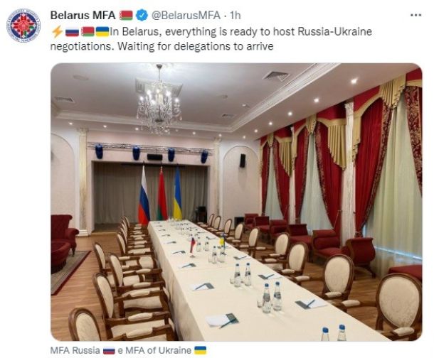 GOMEL – In Bielorussia tutto è pronto per ospitare i negoziati Russia-Ucraina. In attesa dell’arrivo delle delegazioni”. Lo ha twittatto poco fa il ministero degli Esteri bielorusso accompagnando l’annuncio dei negoziati tra Kiev e Mosca con una foto della sede a Gomel, al confine tra Ucraina e Bielorussia, nell’area del fiume Pripyat. La delegazione ucraina che partecipa ai colloqui tra Kiev e Mosca è arrivata in territorio bielorusso. Lo riporta Nexta, mentre il ministero degli Esteri della Bielorussia ha twittato una foto della sede dei colloqui.