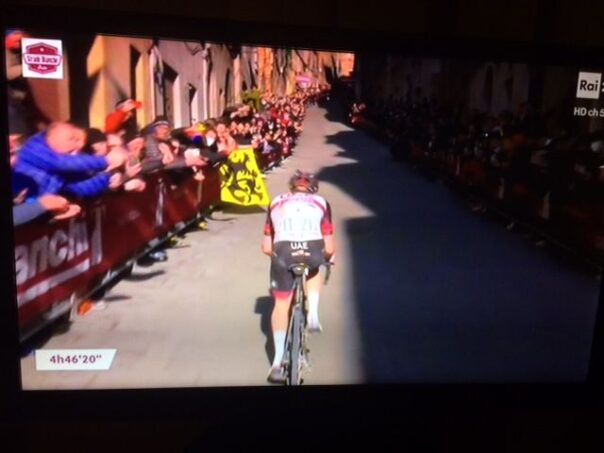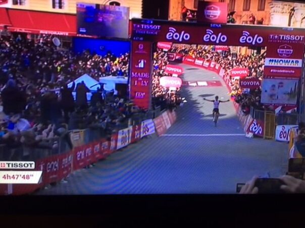 l’eterno Alejandro Valverde che su via Santa Caterina si scrolla di dosso Kasper Asgreen, diventato l’uomo di punta della QuickStep-AlphaVinyl dopo il crollo di Julian Alaphilippe e alla fine terzo. Il giovane fuoriclasse sloveno accelera ai -50, in una prova fin lì segnata da una fuga a nove poi neutralizzata e una maxi-caduta di gruppo sullo sterrato a causa di un colpo di vento L’attacco di Pogacar in discesa sul Monte Sante Marie ha sparigliato le carte e in poche pedalate lo sloveno ha fatto il vuoto.
