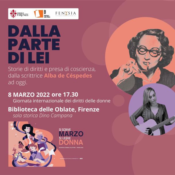 In occasione della Giornata internazionale dei diritti delle donne, martedì 8 marzo alle ore 17.30 presso la Biblioteca delle Oblate di Firenze (via dell’Oriuolo 24, sala Dino Campana), è in programma “Dalla parte di lei”, storie di diritti e di presa di coscienza, dalla scrittrice Alba de Céspedes a oggi.