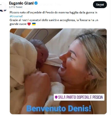 PESCIA (Pt) – “Benvenuto Denis! Piccolo nato all’ospedale di Pescia da mamma fuggita dalla guerra in #Ucraina! Grazie ai nostri operatori della sanità e accoglienza, la Toscana ha un grande cuore”, così il governatore della Toscana ha saluto il lieto evento su twitter.