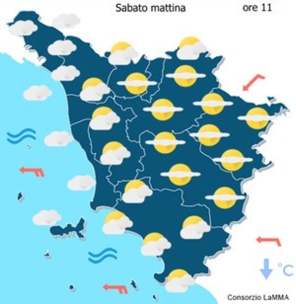 Sabato 12 Marzo – Stato del cielo e fenomeni: parzialmente nuvoloso con transito di velature e addensamenti a tratti più consistenti sulla costa, Arcipelago e in Appennino, in particolare sui versanti emiliano romagnoli. Venti: moderati orientali con rinforzi su costa e Arcipelago. Mari: poco mossi sottocosta, mossi o molto mossi a largo. Temperature: minime stazionarie con locali gelate in pianura, massime in deciso calo con valori fino a 10-12 gradi (valori inferiori alle medie del periodo). Molto freddo in montagna (probabile giornata di ghiaccio oltre i 1500 metri).