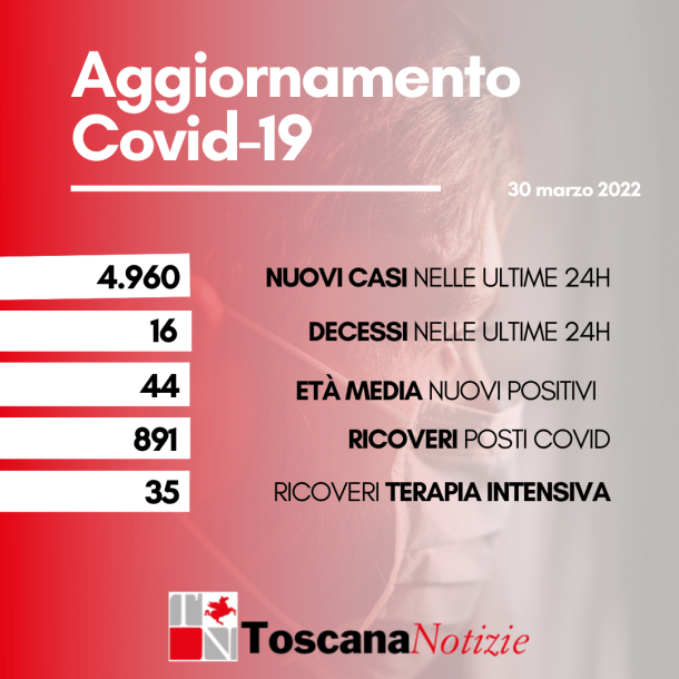 FIRENZE – Sono 16 i morti per coronavirus, in Toscana, oggi 30 marzo 2022. Si tratta di 8 uomini e 8 donne con età media di 84 anni. Mentre sono 4.960 i nuovi contagiati (1.314 confermati con tampone molecolare e 3.646 da test rapido antigenico) con età media di 44 anni (20% ha meno di 20 anni, 21% tra 20 e 39 anni, 32% tra 40 e 59 anni, 19% tra 60 e 79 anni, 8% ha 80 anni o più). In Toscana sono 979.079 i casi di positività da inizio pandemia. I nuovi casi sono lo 0,5% in più rispetto al totale del giorno precedente. I guariti crescono dello 0,7% e raggiungono quota 921.906 (94,2% dei casi totali). Oggi sono stati eseguiti 7.584 tamponi molecolari e 24.560 tamponi antigenici rapidi, di questi il 15,4% è risultato positivo. Sono invece 7.825 i soggetti testati oggi (con tampone antigenico e/o molecolare, escludendo i tamponi di controllo), di cui il 63,4% è risultato positivo. Gli attualmente positivi sono oggi 47.688, -2,2% rispetto a ieri. I ricoverati sono 891 (8 in più rispetto a ieri), di cui 35 in terapia intensiva (3 in meno).