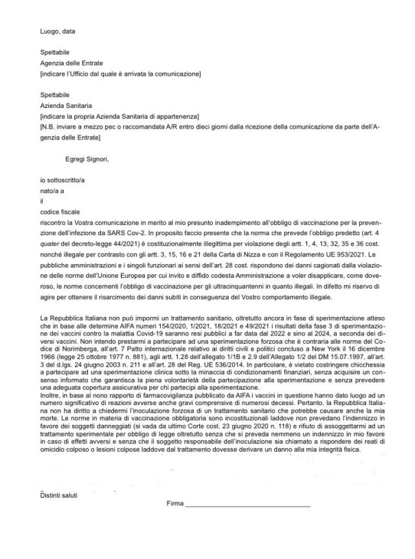 Cicola già in rete, fra i Novax, un modulo di ricordo, che riproduciamo a puro titolo informativo, senza assumercene la responsabilità:
