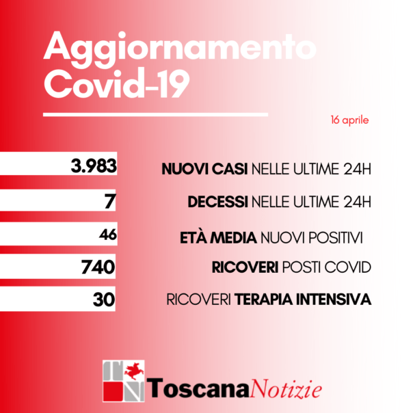 Covid in Tocana: 7 morti (5 uomini e 2 donne), oggi 16 aprile. E 3.983 nuovi contagiati