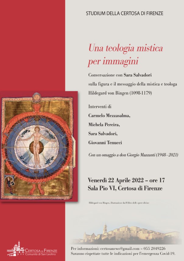Firenze – Iniziato nel giugno del 2021, il ciclo d’incontri alla Certosa di Firenze dedicati ai 700 anni dalla morte di Dante Alighieri, nell’ambito di 1321 – 2021. Nei dintorni di un Centenario, è giunto all’ultimo appuntamento. Venerdì 22 aprile alle 17 nella Sala Pio VI della Certosa di Firenze è in programma Una teologia mistica per immagini, conversazione con Sara Salvadori sulla figura e il messaggio della mistica e teologa Hildegard von Bingen (1098-1179), con un ricordo di don Giorgio Mazzanti. Sono previsti gli interventi di Carmelo Mezzasalma (Presidente del Comitato scientifico della Certosa di Firenze e superiore della Comunità di San Leolino), Michela Pereira (già Ordinaria di Storia della Filosofia Medievale presso l’Università di Siena), Sara Salvadori (ricercatrice e musicista) e Giovanni Tenucci (storico dell’arte).