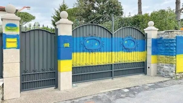 Forte dei Marmi: cancello villa di russi dipinto di giallo e blu, colori dell’Ucraina