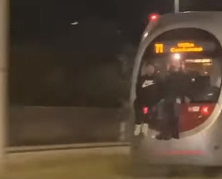 FIRENZE – Sta spopolando sul web il video che mostra due giovani pericolosamente appesi all’esterno del vagone di coda di un convoglio della tramvia di Firenze in una corsa serale, o notturna, verso Scandicci. I due sono in equilibrio precario e per contrastare i flussi aerodinamici e i sussulti del mezzo che potrebbero sbalzarli a terra cercano di aggrapparsi il più possibile al vetro. Nei commenti qualcuno parla di baby gang. Altri, forse più opportunamente, di baby idiots.
