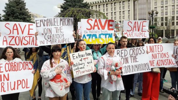 Con il viso dipinto di rosso sangue o dei colori della bandiera nazionale, le donne hanno intonato l’inno nazionale e scandito slogan rivolti al governo di Kiev, all’Onu, alla Croce Rossa: “salvate Mariupol”, “salvare i nostri bambini”, “salvate i nostri soldati”, “salvate Azovstal”, ma anche contro “Putin assassino”.