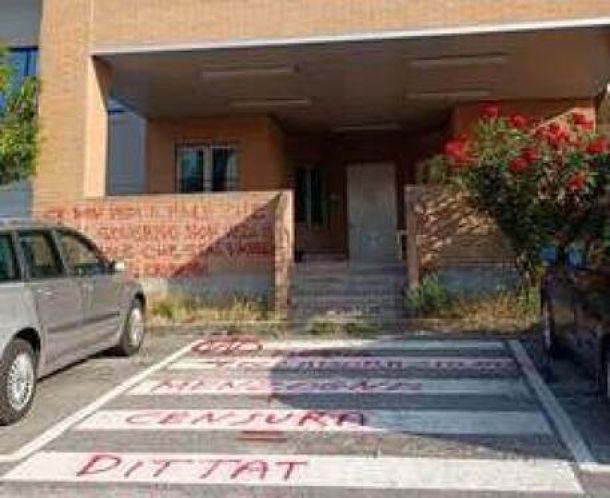 FIRENZE – Sono stati imbrattati i muri della facciata della sede dell’emittente televisiva Tvl di Pistoia con scritte in vernice rossa firmate da una doppia V cerchiata. “Se non vedi il male che fa il governo, non vedi il male che stai facendo. Nazisti, criminali”, si legge in una scritta. In un’altra, fatta sull’asfalto davanti all’ingresso, c’è scritto invece ‘Menzogne più censura uguale dittatura’”.