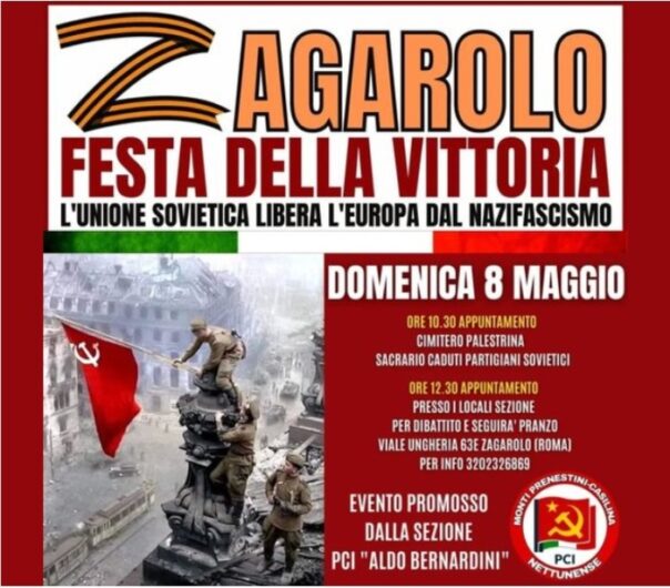 A confezionare la locandina delle polemiche il Partito Comunista Monti Tiburtini Casilina in occasione dell’evento del prossimo 8 maggio a Zagarolo, un giorno in anticipo rispetto alla data della vittoria russa sui nazisti nel ’45. Data che da più parti inoltre viene indicata come prescelta da Putin per mettere fine all’invasione dell’Ucraina proprio per accostarla al 77° anniversario alla vittoria dell’Unione Sovietica nella seconda guerra mondiale.