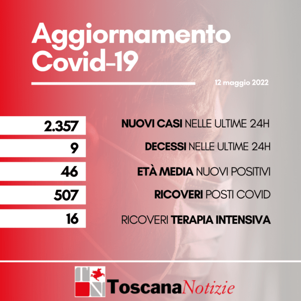 Covid Toscana: 9 morti (età media 76,4 anni), oggi 12 maggio, 2.357 nuovi casi, tasso al 15,3%