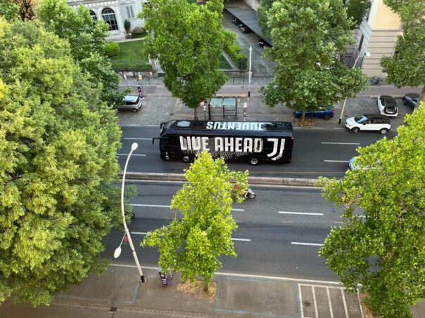 FIRENZE – Ore 19,15, il pullman che trasporta la squadra bianconera al Franchi attraversa i viali di circonvallazione con una staffetta, circondato dalle auto dei fiorentini che circolano. come sempre sui viali. La partita con i gobbi è sempre stata caratterizzata dalla rivalità delle due tifoserie e quindi seguita con molta cura ed attenzione dalle Autorità di sicurezza per prevenire incidenti. Mentre il pullman bianconero transitava sui viali si sentiva nettamente l’elicottero della polizia che volteggiava sulla zona di Campo di Marte per controllare la situazione. La foto è di Firenzepost.