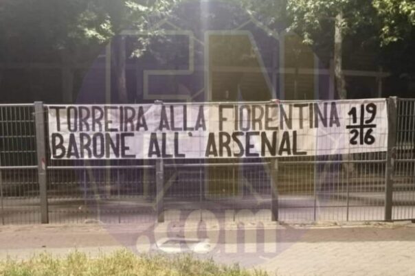 FIRENZE – “Torreira alla Fiorentina, Barone all’Arsenal”. Così lo striscione, con tanto spirito fiorentino, firmato dal violaclub ‘1926’ affisso dalla scorsa notte, fra il 25 e 26 maggio 2022, all’esterno dello stadio ‘Franchi’ in merito al riscatto del centrocampista di proprietà dell’Arsenal.