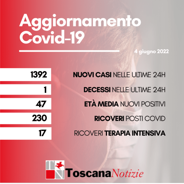 FIRENZE – E’ morto un uomo di 71 anni, per coronavirus, oggi 4 giugno 2022, in Toscana.. Risiedeva in provincia di Pisa. Anche un solo decesso è comunque una tragedia. L’augurio è che si arrivi all’ok degli americani: ossia zero killed, zero uccisi. Sono invece 1.392 i nuovi contagiati (233 confermati con tampone molecolare e 1.159 da test rapido antigenico) con età media di 47 anni (12% ha meno di 20 anni, 19% tra 20 e 39 anni, 31% tra 40 e 59 anni, 29% tra 60 e 79 anni, 9% ha 80 anni o più). In Toscana sono 1.154.838 i casi di positività da inizio pandemia. I nuovi casi sono lo 0,1% in più rispetto al totale del giorno precedente. I guariti crescono dello 0,2% e raggiungono quota 1.119.113 (96,9% dei casi totali). Oggi sono stati eseguiti 1.250 tamponi molecolari e 8.999 tamponi antigenici rapidi, di questi il 13,6% è risultato positivo. Sono invece 2.022 i soggetti testati oggi (con tampone antigenico e/o molecolare, escludendo i tamponi di controllo), di cui il 68,8% è risultato positivo. Gli attualmente positivi sono oggi 25.625, -1,8% rispetto a ieri. I ricoverati sono 230 (17 in meno rispetto a ieri), di cui 17 in terapia intensiva (stabili).