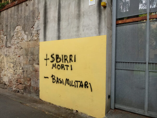 Alcune scritte sono firmate con simboli anarchici. ‘Basta basi militari’, ‘+Sbirri morti, – basi’, ‘Sparare a chi promuove il nucleare è il minimo’, ‘Sbirri torturatori’, sono alcune delle decine dei scritte lasciate con vernice nera.