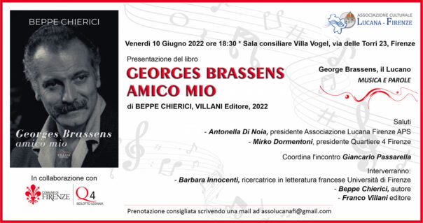 FIRENZE – Venerdì 10 giugno alle 18.30 nella Sala Consiliare di Villa Vogel (via delle Torri 23, Firenze) si presenta il neonato libro «Georges Brassens, amico mio» di Beppe Chierici (ed. Villani, 2022); coordinati da Giancarlo Passarella, parleranno lo stesso Beppe Chierici (che ha tradotto anche tutte le canzoni del sommo chansonnier), il suo editore Franco Villani, e Barbara Innocenti, ricercatrice di Letteratura francese all’Università di Firenze. Non è un libro come un altro scritto da un esperto come un altro: Beppe Chierici è a sua volta un cantautore che, a metà anni Settanta, si guadagnò un pubblico apprezzamento da parte di Brassens, che in una lettera apparsa su Paese Sera scrisse «Ero convinto che la maggior parte delle mie canzoni – e specialmente quelle chiamate paillardes, in cui le parole non hanno poi quei significati scabrosi che sembrano avere – non potessero assolutamente essere tradotte. Il mio amico Chierici mi ha fatto ricredere e smentisce il noto detto traduttore-traditore. Inoltre si è concesso il lusso di metter su un’opera originale e personale, pur rispettando in tutto lo stile dell’autore, gli dico bravo e lo ringrazio calorosamente di esser riuscito a rendere godibili in italiano questi gauloiseries, ciò che non era affare da poco!». Come sa chiunque si diletti un po’ di canzone d’autore, il grande Georges Brassens, che se non fosse morto di cancro a soli sessant’anni ora ne avrebbe 100 e mezzo, ebbe molta influenza sulla cosiddetta “scuola genovese”; Fabrizio De André ne tradusse nel 1968 «Il gorilla», canzone del 1947 che, dietro la divertente storiella raccontata, veicolava un messaggio contro la pena di morte (in Francia abolita solo il 9 ottobre 1981, 20 giorni prima che morisse Brassens); il brano fu così bandito dalla radio francese, ma, come spesso accade alle canzoni censurate, diventò famoso anche fuori confine, perché all’epoca il francese lo conoscevano in tanti. Fra le 13 canzoni di Brassens tradotte da De André ci sono anche brani famosissimi come «Bocca di rosa» (Brave Margot), «La città vecchia» (Le bistrot), «Morire per delle idee» (Mourir pour des idées), «Le passanti» (Les passantes), «Marcia nuziale» (Marche nuptiale), «Nell’acqua della chiara fontana» (Dans l’eau de la claire fontaine”). Un altro nostro grande cantautore-traduttore di Brassens è stato Nanni Svampa, che ha adattato molte canzoni sia in dialetto milanese sia in italiano, ma nessuno, a parte Beppe Chierici, che di Brassens è stato collaboratore in vita, ha compiuto l’impresa di tradurre l’intero corpus (150 pezzi), lavorando nell’ultimo anno anche 20 ore al giorno pur di compierla, dopo che nel luglio 2021 Giancarlo Passarella aveva svegliato l’interesse dell’editore Franco Villani, originario come Passarella di un paese lucano vicino a quello donde veniva la madre di Georges Brassens (un meridionale a tutto tondo, visto per nascita era occitano). Villani ha reperito, per il volume, altri collaboratori che trattassero differenti aspetti dell’illustre cantautore di Sète, mentre lo stesso Passarella ne ha scritto l’introduzione e ha intervistato a tutto tondo Beppe Chierici, partendo anche da un suo cameo di attore nella serie televisiva DOC con Luca Argentero. Così, in un anno scarso di lavoro alacre e di scavo accurato, perché l’attenzione per i deboli e gli ultimi che caratterizza la scrittura di Brassens si comprende solo se si conosce l’humus nel quale è cresciuto, dando il giusto peso anche alla peculiarità della Basilicata, sempre nel cuore di sua madre, il libro ha visto la luce e venerdì 10 giugno, con l’ausilio dell’Associazione Culturale Lucana di Firenze, verrà presentato a Villa Vogel, dove si parlerà giustappunto di Georges Brassens, il Lucano.