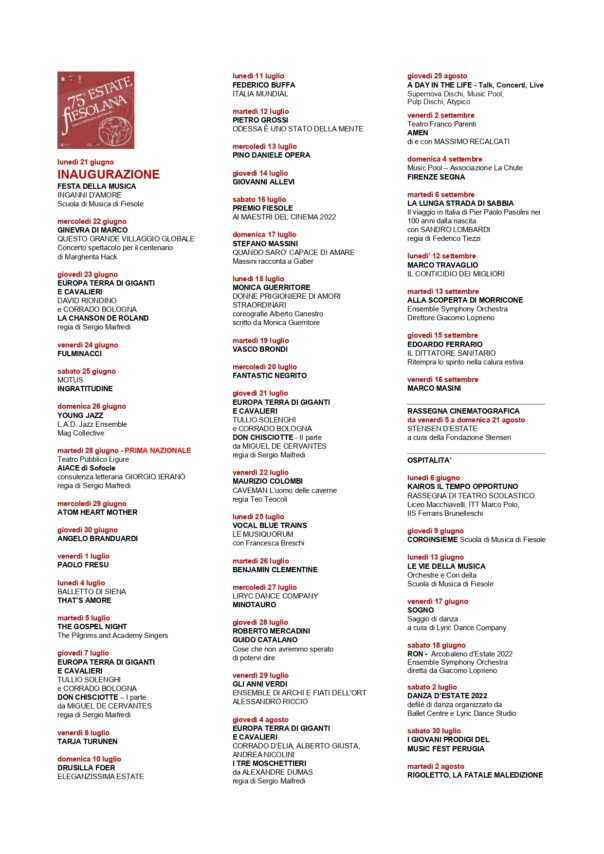 Successivamente fino al 6 settembre sul palco verranno proposti concerti, eventi teatrali e di danza, letture e proiezioni cinematografiche. Alcune serate saranno organizzate in collaborazione con la Scuola di Musica di Fiesole e con il Teatro Puccini, mentre con il Teatro della Toscana verrà rappresentato il testo Donne prigioniere di amori straordinari, scritto ideato e interpretato da Monica Guerritore con le coreografie ed i danzatori della compagnia di Alberto Canestro. Si conferma anche quest’anno la presenza del Teatro Pubblico Ligure per una prima nazionale del ciclo epico Europa terra di Giganti e Cavalieri: Roland, Don Chisciotte, I Tre Moschettieri, il nuovo progetto in quattro serate di Sergio Maifredi con la consulenza letteraria di Corrado Bologna e del grecista Giorgio Ieranò. Presente la musica italiana con Ginevra Di Marco, Fulminacci, Angelo Branduardi, Paolo Fresu, Giovanni Allevi, Vasco Brondi, ed internazionale con Tarja Turunen e Fantastic Negrito. Fra gli appuntamenti di prosa, La lunga strada di sabbia, il viaggio in Italia di Pier Paolo Pasolini recitato da Sandro Lombardi per la Compagnia Lombardi Tiezzi e Amen, una produzione del Teatro Franco Parenti, dal testo rivelazione che lo psicanalista Massimo Recalcati ha scritto durante la pandemia. Spazio al teatro d’autore con le narrazioni di Federico Buffa, Roberto Mercadini, Guido Catalano e lo scrittore fiorentino Pietro Grossi, che con la loro capacità di narrazione daranno vita a storie e riflessioni sul nostro tempo. La danza avrà molte serate messe in scena dal Balletto di Siena e dalle compagnie di danza moderna Motus e Lyric Dance Company, mentre l’ensemble di archi e fiati dell’ORT – Orchestra della Toscana torna a Fiesole, dopo il successo della scorsa edizione, insieme ad Alessandro Riccio in Gli anni Verdi. Il Cinema è ben rappresentato all’interno del festival a partire dal prestigioso Premio Fiesole ai Maestri del Cinema (sabato 16 luglio) e la rassegna Il cinema sotto le stelle curata dalla Fondazione Stensen, in visione per due settimane (dal 5 al 21 agosto). Già introvabili i biglietti per Drusilla Foer col suo Eleganzissima e per Caveman l’uomo delle caverne con Maurizio Colombi.